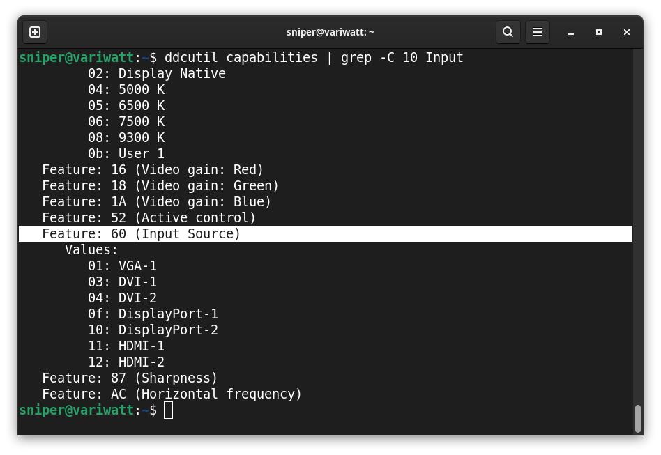 Можно переключать входы монитора. Для этого собираем доступные capabilities и ищем параметр, связанный с используемым интерфейсом